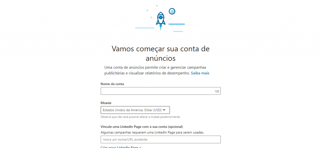 Caso você ainda não tenha uma conta no Gerenciador de Campanhas, terá que criar uma. Preencha com o nome da conta e a moeda com que você irá pagar o anúncio.