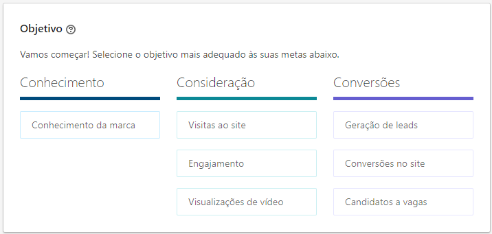 Você pode escolher entre os diversos objetivos disponíveis. Eles são divididos em três categorias: Conhecimento, Consideração e Conversão.