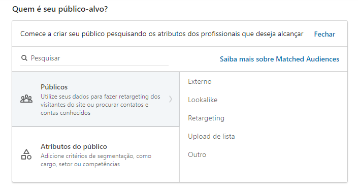 Existem mais de 20 categorias de segmentação que você pode escolher: Tamanho da empresa, cargo, nível de experiência, instituição de ensino e muito mais.