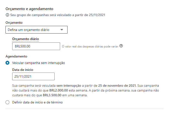 Além da forma de pagamento, você precisa dar um lance sugerido e definir o orçamento diário, data de início, data do término e orçamento total da sua campanha.