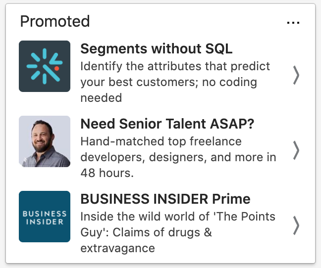 Os conteúdos patrocinados permitem que você alcance um alto número de usuários dentro do feed do LinkedIn. Eles são mostrados entre as publicações dos outros usuários e podem ser de três tipos: imagem única, vídeo, ou carrossel.