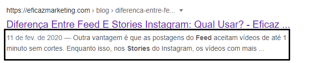 A meta description também pode ser encontrada na página de resultados do Google. Ela fica localizada abaixo da URL e do meta title.