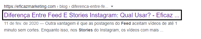 O meta title é aquele título azul que encontramos na página de resultado do Google. Ele precisa ser convincente, direto e chamativo para conseguir atrair a atenção dos usuários e convencê-los de clicar no seu link. É essencial que a palavra-chave esteja presente aqui.