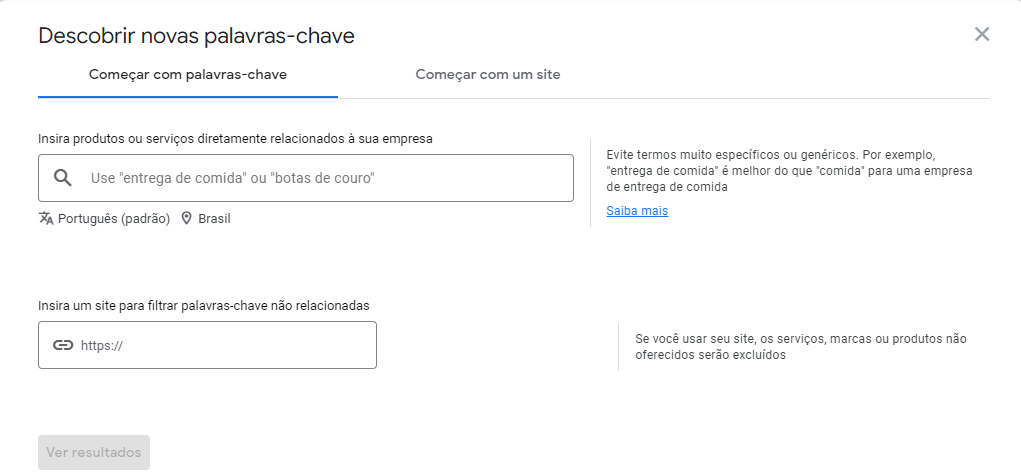 Usar o planejador de palavras-chave é simples, basta entrar no site e entrar com sua conta do Ads. Selecione a opção descobrir novas palavras-chave e depois é só adicionar os assuntos, termos ou palavras que você já tem.