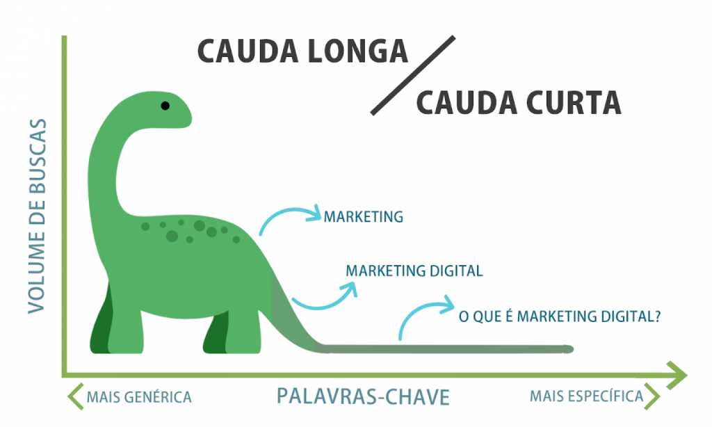 As palavras-chave chamadas short tail (cauda curta) são termos mais genéricos, que englobam uma grande área de atuação. Normalmente é composta por apenas um termo, como no exemplo “Marketing”, mas podem ter até 2.