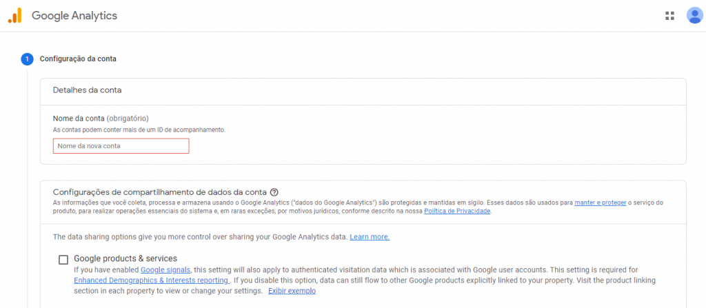 Depois que entrar na página do Analytics, clique em “Iniciar avaliação gratuita”. Você será direcionado para página de configuração da conta.