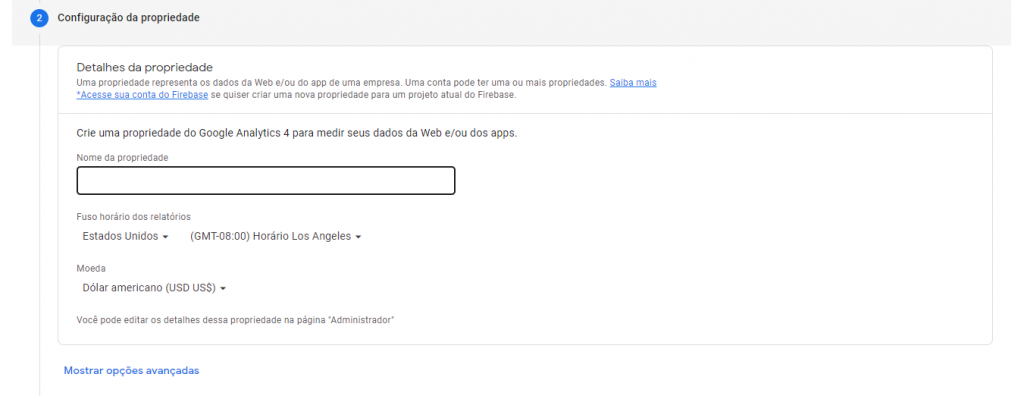 Depois, você precisará preencher com o Nome da propriedade. A propriedade representa os dados da web ou do aplicativo. Você pode usar a mesma conta para analisar diversos sites.