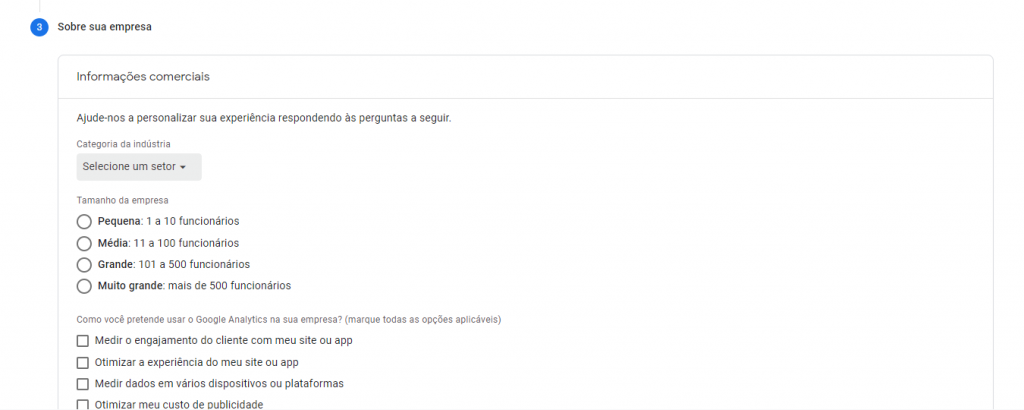 Quando clicar em continuar, irá aparecer as configurações comerciais para serem preenchidas. Primeiro, Selecione um setor da sua indústria. Depois, o Tamanho da Empresa e marque como você pretende usar o Analytics.