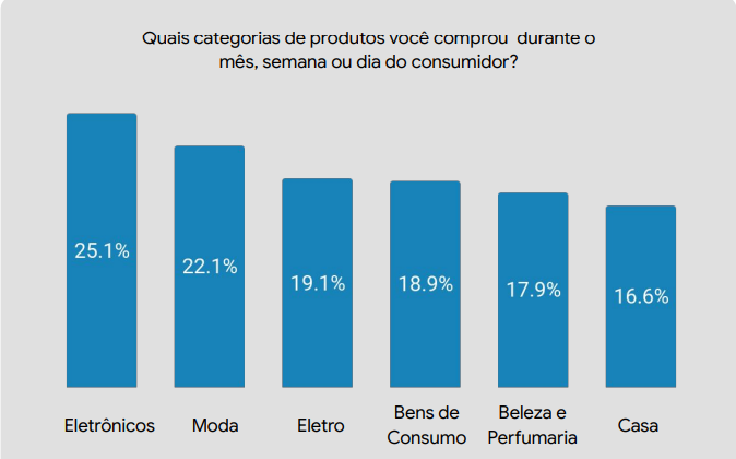 Os departamentos de eletrônicos, moda e eletroeletrônicos foram os mais consumidos. Conforme o levantamento, 25.1% dos entrevistados compraram aparelhos eletrônicos, 22.1% itens de moda (Vestuário, calçados e acessórios) e 19.1% compraram eletroeletrônicos (Eletrodomésticos e portáteis).