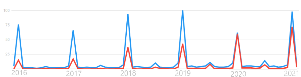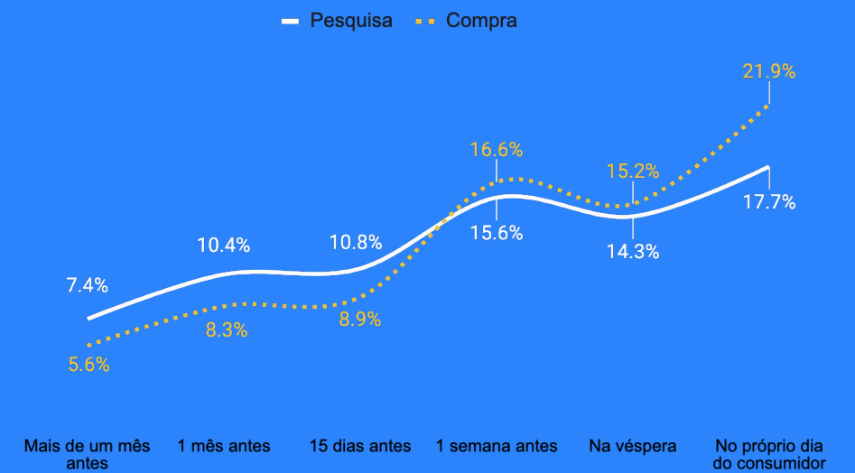 Além disso, a pesquisa revelou mais estabilidade nas buscas durantes as 3 semanas anteriores a data. Ou seja, em 2021, os clientes passaram a fazer buscas com antecipação, não apenas deixando para procurar no dia.