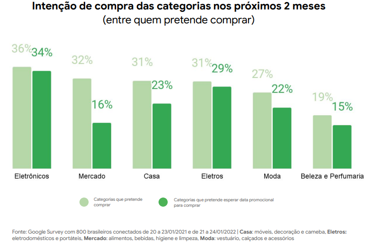 A expectativa para 2022 está nas categorias de eletrônico, mercado e casa. Mas vale ressaltar que existe uma parcela de consumidores de Eletros e Moda que está apenas esperando uma data promocional para realizar seus desejos de consumo.
