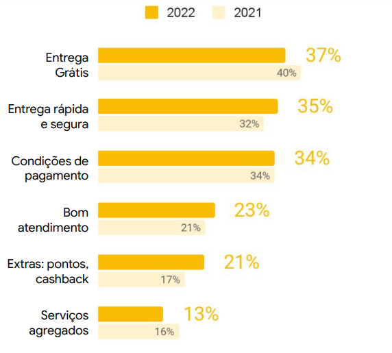 Entre os benefícios citados, Entrega Grátis, Condições de Pagamento e Qualidade na Entrega, aparecem como os que mais influenciaram o consumidor na hora da compra.