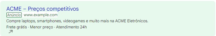 Com as extensões de frase de destaque, você pode promover ofertas, frete grátis, atendimento 24 horas e o que mais quiser. Elas são mostradas abaixo do texto do seu anúncio e você pode adicionar até 10 frases.