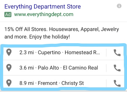 As extensões de local incentivam que os clientes visitem sua loja física. Ela pode ser composta pela localização da sua empresa, por um botão com uma CTA (Chamada para Ação) ou um link que possua mais informações sobre sua empresa e como chegar até ela.