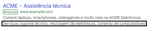 Com os Snippets estruturados você consegue mostrar seus produtos e serviços por categorias ou outra característica. Eles são exibidos em formato de títulos, mostrando outros tipos de produtos relevante e que seu site oferece. Você pode preencher com diversos títulos, que serão selecionados pelo Google na hora de mostrar o anúncio.