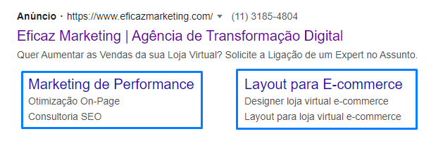 Extensões de sitelinks servem para direcionar os usuários para alguma página específica dentro do seu próprio site. Alguns exemplos de sitelinks é “Horário de atendimento”, “comprar agora” ou alguma categoria de produto relacionado ao seu negócio.