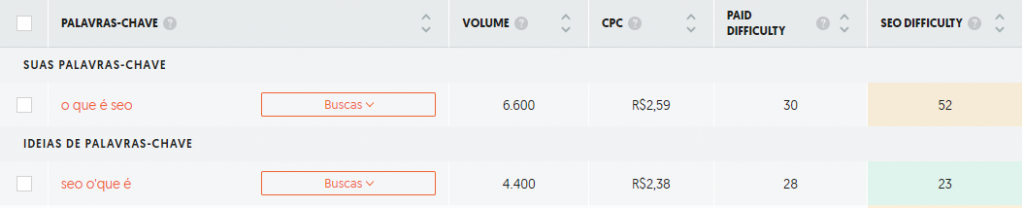 Após realizar a pesquisa você consegue saber o volume de pesquisa das palavras, a dificuldade e sugestões de outras palavras-chave que podem ser relevantes para o seu negócio.
