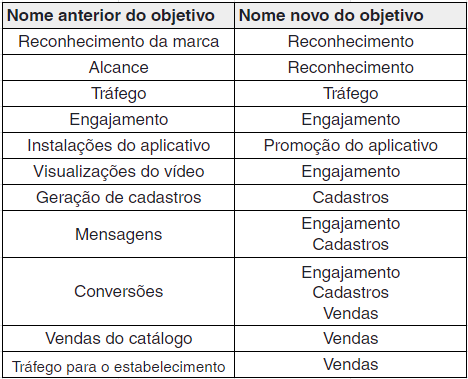 Confira a baixo, a tabela com as mudanças de nomes e o que cada um dos objetivos pode proporcionar para sua marca: